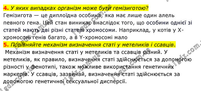4. У яких випадках організм може бути гемізиготою? Гемізигота — це диплоїдна особина, яка має лише один алель певного гена. Цей стан виникає внаслідок того, що особини однієї зі статей мають дві різні статеві хромосоми. Наприклад, у котів у Х-хромосомі генів багато, а в Y-хромосомі мало 5. Порівняйте механізм визначення статі у метеликів і ссавців. Механізм визначення статі у метеликів та ссавців різний. У метеликів, як правило, визначення статі здійснюється за допомогою різності у фенотипі, також можливе використання генетичних маркерів. У ссавців, зазвичай, визначення статі здійснюється за допомогою генетичної сексуальної дисперсії.