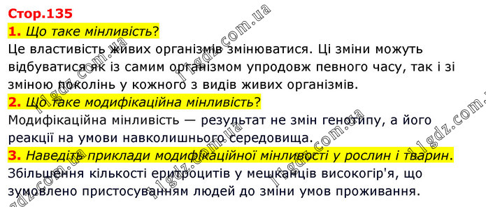 1. Що таке мінливість? Це властивість живих організмів змінюватися. Ці зміни можуть відбуватися як із самим організмом упродовж певного часу, так і зі зміною поколінь у кожного з видів живих організмів. 2. Що таке модифікаційна мінливість? Модифікаційна мінливість — результат не змін генотипу, а його реакції на умови навколишнього середовища. 3. Наведіть приклади модифікаційної мінливості у рослин і тварин. Збільшення кількості еритроцитів у мешканців високогір'я, що зумовлено пристосуванням людей до зміни умов проживання.