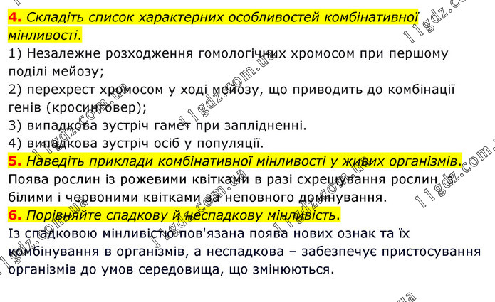 4. Складіть список характерних особливостей комбінативної мінливості. 1) Незалежне розходження гомологічних хромосом при першому поділі мейозу; 2) перехрест хромосом у ході мейозу, що приводить до комбінації генів (кросинговер); 3) випадкова зустріч гамет при заплідненні. 4) випадкова зустріч осіб у популяції. 5. Наведіть приклади комбінативної мінливості у живих організмів. Поява рослин із рожевими квітками в разі схрещування рослин з білими і червоними квітками за неповного домінування. 6. Порівняйте спадкову й неспадкову мінливість. Із спадковою мінливістю пов'язана поява нових ознак та їх комбінування в організмів, а неспадкова – забезпечує пристосування організмів до умов середовища, що змінюються.