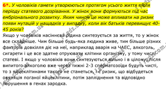 У чоловіків гамети утворюються протягом усього життя після періоду статевого дозрівання. У жінок вони формуються під час ембріонального розвитку. Яким чином це може впливати на ризик появи мутацій у нащадків у випадку, коли вік батьків перевищує 40-45 років? Якщо у чоловіків насіннєва рідина синтезується за життя, то у жінок все складніше. Чим більше будь-яка людина живе, тим більше різних факторів довкілля діє на неї, наприклад аварія на ЧАЕС, алкоголь, сигарети і це все здатне отруювати клітини організму, у тому числі статеві. І якщо у чоловіків вони синтезуються вільно і в цілому, після випитого алкоголю вже через тижні 2-3 сперматозоїди будуть чисті, то з яйцеклітинами такого не станеться, і є ризик, що відбудеться овуляція поганої яйцеклітини, потім запліднення та відповідно порушення в генах зародка.