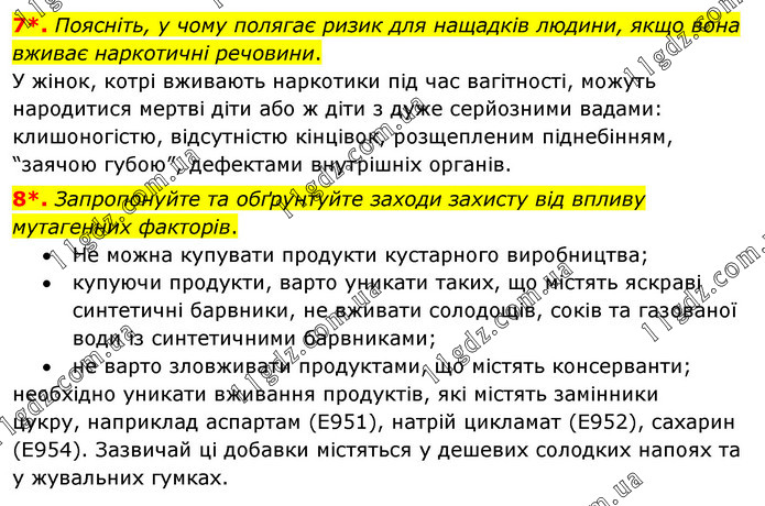 7*. Поясніть, у чому полягає ризик для нащадків людини, якщо вона вживає наркотичні речовини. У жінок, котрі вживають наркотики під час вагітності, можуть народитися мертві діти або ж діти з дуже серйозними вадами: клишоногістю, відсутністю кінцівок, розщепленим піднебінням, “заячою губою”, дефектами внутрішніх органів. 8*. Запропонуйте та обґрунтуйте заходи захисту від впливу мутагенних факторів. · Не можна купувати продукти кустарного виробництва; · купуючи продукти, варто уникати таких, що містять яскраві синтетичні барвники, не вживати солодощів, соків та газованої води із синтетичними барвниками; · не варто зловживати продуктами, що містять консерванти; необхідно уникати вживання продуктів, які містять замінники цукру, наприклад аспартам (Е951), натрій цикламат (Е952), сахарин (Е954). Зазвичай ці добавки містяться у дешевих солодких напоях та у жувальних гумках.