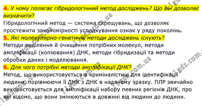 4. У чому полягає гібридологічний метод досліджень? Що він дозволяє визначити? Гібридологічний метод — система схрещувань, що дозволяє простежити закономірності успадкування ознак у ряду поколінь. 5. Які молекулярно-генетичні методи досліджень існують? Методи виділення й очищення потрібних молекул, методи ампліфікації (копіювання) ДНК, методи гібридизації та методи обробки даних і моделювання. 6. Для чого потрібні методи ампліфікації ДНК? Метод, що використовується в криміналістиці для ідентифікації людини, порівнюючи її ДНК з ДНК в наданому зразку. ПЛР звичайно використовується для ампліфікації набору певних регіонів ДНК, про які відомо, що вони змінюються в довжині від людини до людини.
