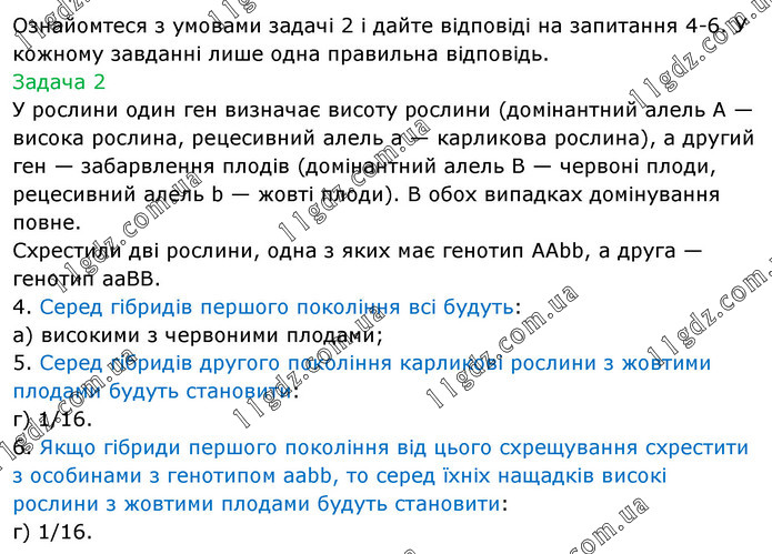 Ознайомтеся з умовами задачі 2 і дайте відповіді на запитання 4-6. У кожному завданні лише одна правильна відповідь. Задача 2 У рослини один ген визначає висоту рослини (домінантний алель А — висока рослина, рецесивний алель а — карликова рослина), а другий ген — забарвлення плодів (домінантний алель В — червоні плоди, рецесивний алель b — жовті плоди). В обох випадках домінування повне. Схрестили дві рослини, одна з яких має генотип ААbb, а друга — генотип ааВВ. 4. Серед гібридів першого покоління всі будуть: а) високими з червоними плодами; 5. Серед гібридів другого покоління карликові рослини з жовтими плодами будуть становити: г) 1/16. 6. Якщо гібриди першого покоління від цього схрещування схрестити з особинами з генотипом ааbb, то серед їхніх нащадків високі рослини з жовтими плодами будуть становити: г) 1/16.