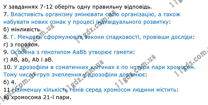 У завданнях 7-12 оберіть одну правильну відповідь. 7. Властивість організму змінювати свою організацію, а також набувати нових ознак у процесі індивідуального розвитку: б) мінливість. 8. Г. Мендель сформулював закони спадковості, провівши досліди: г) з горохом. 9. Особина з генотипом АаBb утворює гамети: г) АВ, аb, Аb і аВ. 10. У дрозофіли в соматичних клітинах є по чотири пари хромосом. Тому число груп зчеплення у дрозофіли дорівнює: б) 4. 11 Найменшу кількість генів серед хромосом людини містить: в) хромосома 21-ї пари.