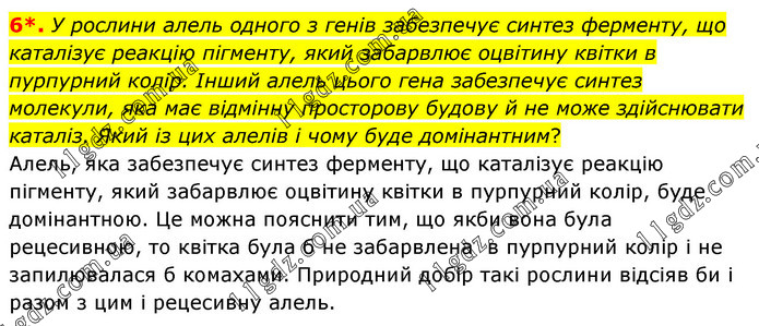 У рослини алель одного з генів забезпечує синтез ферменту, що каталізує реакцію пігменту, який забарвлює оцвітину квітки в пурпурний колір. Інший алель цього гена забезпечує синтез молекули, яка має відмінну просторову будову й не може здійснювати каталіз. Який із цих алелів і чому буде домінантним? Алель, яка забезпечує синтез ферменту, що каталізує реакцію пігменту, який забарвлює оцвітину квітки в пурпурний колір, буде домінантною. Це можна пояснити тим, що якби вона була рецесивною, то квітка була б не забарвлена в пурпурний колір і не запилювалася б комахами. Природний добір такі рослини відсіяв би і разом з цим і рецесивну алель.