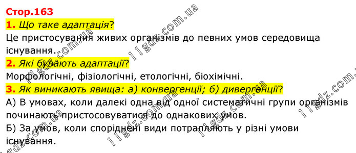 1. Що таке адаптація? Це пристосування живих організмів до певних умов середовища існування. 2. Які бувають адаптації? Морфологічні, фізіологічні, етологічні, біохімічні. 3. Як виникають явища: а) конвергенції; б) дивергенції? А) В умовах, коли далекі одна від одної систематичні групи організмів починають пристосовуватися до однакових умов. Б) За умов, коли споріднені види потрапляють у різні умови існування.