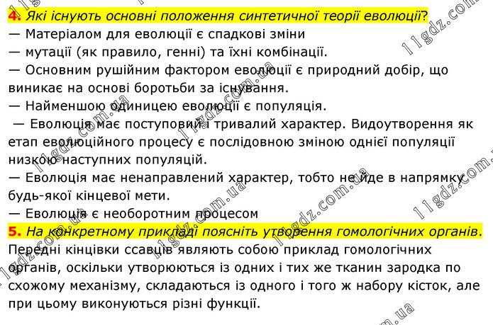 4. Які існують основні положення синтетичної теорії еволюції? — Матеріалом для еволюції є спадкові зміни — мутації (як правило, генні) та їхні комбінації. — Основним рушійним фактором еволюції є природний добір, що виникає на основі боротьби за існування. — Найменшою одиницею еволюції є популяція. — Еволюція має поступовий і тривалий характер. Видоутворення як етап еволюційного процесу є послідовною зміною однієї популяції низкою наступних популяцій. — Еволюція має ненаправлений характер, тобто не йде в напрямку будь-якої кінцевої мети. — Еволюція є необоротним процесом 5. На конкретному прикладі поясніть утворення гомологічних органів. Передні кінцівки ссавців являють собою приклад гомологічних органів, оскільки утворюються із одних і тих же тканин зародка по схожому механізму, складаються із одного і того ж набору кісток, але при цьому виконуються різні функції.