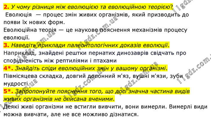 2. У чому різниця між еволюцією та еволюційною теорією? Еволюція — процес змін живих організмів, який призводить до появи їх нових форм. Еволюційна теорія — це наукове пояснення механізмів процесу еволюції. 3. Наведіть приклади палеонтологічних доказів еволюції. Наприклад, знайдені рештки пернатих динозаврів свідчать про спорідненість між рептиліями і птахами 4*. Знайдіть сліди еволюційних змін у вашому організмі. Півмісяцева складка, довгий долонний м'яз, вушні м'язи, зуби мудрості. 5*. Запропонуйте пояснення того, що досі значна частина видів живих організмів не описана вченими. Деякі живі організми не встигли вивчити, вони вимерли. Вимерлі види можна вивчати, але не все можливо дізнатися.
