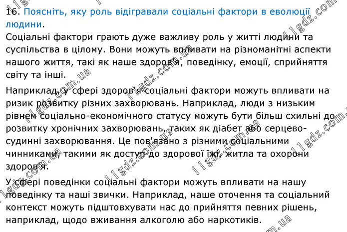 Поясніть, яку роль відігравали соціальні фактори в еволюції людини. Соціальні фактори грають дуже важливу роль у житті людини та суспільства в цілому. Вони можуть впливати на різноманітні аспекти нашого життя, такі як наше здоров'я, поведінку, емоції, сприйняття світу та інші. Наприклад, у сфері здоров'я соціальні фактори можуть впливати на ризик розвитку різних захворювань. Наприклад, люди з низьким рівнем соціально-економічного статусу можуть бути більш схильні до розвитку хронічних захворювань, таких як діабет або серцево-судинні захворювання. Це пов'язано з різними соціальними чинниками, такими як доступ до здорової їжі, житла та охорони здоров'я. У сфері поведінки соціальні фактори можуть впливати на нашу поведінку та наші звички. Наприклад, наше оточення та соціальний контекст можуть підштовхувати нас до прийняття певних рішень, наприклад, щодо вживання алкоголю або наркотиків.