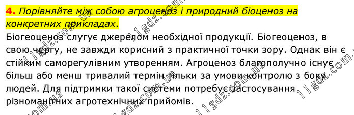 Порівняйте між собою агроценоз і природний біоценоз на конкретних прикладах. Біогеоценоз слугує джерелом необхідної продукції. Біогеоценоз, в свою чергу, не завжди корисний з практичної точки зору. Однак він є стійким саморегулівним утворенням. Агроценоз благополучно існує більш або менш тривалий термін тільки за умови контролю з боку людей. Для підтримки такої системи потребує застосування різноманітних агротехнічних прийомів.