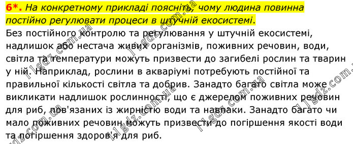 На конкретному прикладі поясніть, чому людина повинна постійно регулювати процеси в штучній екосистемі. Без постійного контролю та регулювання у штучній екосистемі, надлишок або нестача живих організмів, поживних речовин, води, світла та температури можуть призвести до загибелі рослин та тварин у ній. Наприклад, рослини в акваріумі потребують постійної та правильної кількості світла та добрив. Занадто багато світла може викликати надлишок рослинності, що є джерелом поживних речовин для риб, пов'язаних із жирністю води та навпаки. Занадто багато чи мало поживних речовин можуть призвести до погіршення якості води та погіршення здоров'я для риб.
