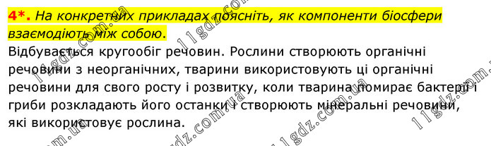 На конкретних прикладах поясніть, як компоненти біосфери взаємодіють між собою. Відбувається кругообіг речовин. Рослини створюють органічні речовини з неорганічних, тварини використовують ці органічні речовини для свого росту і розвитку, коли тварина помирає бактерії і гриби розкладають його останки і створюють мінеральні речовини, які використовує рослина.