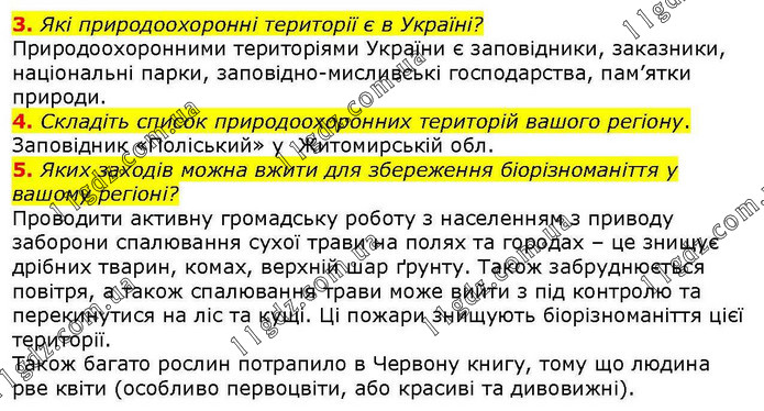 3. Які природоохоронні території є в Україні? Природоохоронними територіями України є заповідники, заказники, національні парки, заповідно-мисливські господарства, пам’ятки природи. 4. Складіть список природоохоронних територій вашого регіону. Заповідник «Поліський» у Житомирській обл. 5. Яких заходів можна вжити для збереження біорізноманіття у вашому регіоні? Проводити активну громадську роботу з населенням з приводу заборони спалювання сухої трави на полях та городах – це знищує дрібних тварин, комах, верхній шар ґрунту. Також забруднюється повітря, а також спалювання трави може вийти з під контролю та перекинутися на ліс та кущі. Ці пожари знищують біорізноманіття цієї території. Також багато рослин потрапило в Червону книгу, тому що людина рве квіти (особливо первоцвіти, або красиві та дивовижні).