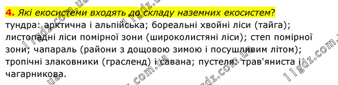 Які екосистеми входять до складу наземних екосистем? тундра: арктична і альпійська; бореальні хвойні ліси (тайга); листопадні ліси помірної зони (широколистяні ліси); степ помірної зони; чапараль (райони з дощовою зимою і посушливим літом); тропічні злаковники (грасленд) і савана; пустеля: трав'яниста і чагарникова.