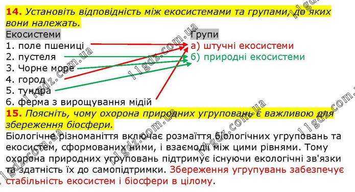 Установіть відповідність між екосистемами та групами, до яких вони належать. 1 – а); 2 – б); 3 – б); 4 – а); 5 – б); 6 – а. 15. Поясніть, чому охорона природних угруповань є важливою для збереження біосфери. Біологічне різноманіття включає розмаїття біологічних угруповань та екосистем, сформованих ними, і взаємодії між цими рівнями. Тому охорона природних угруповань підтримує існуючи екологічні зв'язки та здатність їх до самопідтримки. Збереження угрупувань забезпечує стабільність екосистем і біосфери в цілому.
