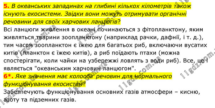 5. В океанських западинах на глибині кількох кілометрів також існують екосистеми. Звідки вони можуть отримувати органічні речовини для своїх харчових ланцюгів? Всі ланцюги живлення в океані починаються з фітопланктону, яким живляться тварини зоопланктону (наприклад рачки, дафнії, і т. д.), тим часом зоопланктон є їжею для багатьох риб, включаючи вусатих китів (планктон є їжею китів), а риб поїдають птахи (можна спостерігати, коли чайки на узбережжі ловлять з води риб). Все, це і являється "океанським харчовим ланцюгом". 6*. Яке значення має колообіг речовин для нормального функціонування екосистем? Забезпечують функціонування основних газів атмосфери – кисню, азоту та підземних газів.