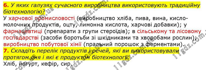6. У яких галузях сучасного виробництва використовують традиційну біотехнологію? У харчової промисловості (виробництво хліба, пива, вина, кисло-молочних продуктів, оцту, лимонна кислота, харчові добавки); у фармацевтиці (препарати з групи стероїдів); в сільському та лісовому господарстві (засоби боротьби зі шкідниками та хворобами рослин); виробництво побутової хімії (пральний порошок з ферментами). 7. Складіть перелік продуктів і речей, які ви використовували протягом дня і які є продуктом біотехнології. Хліб, йогурт, кефір, сир.