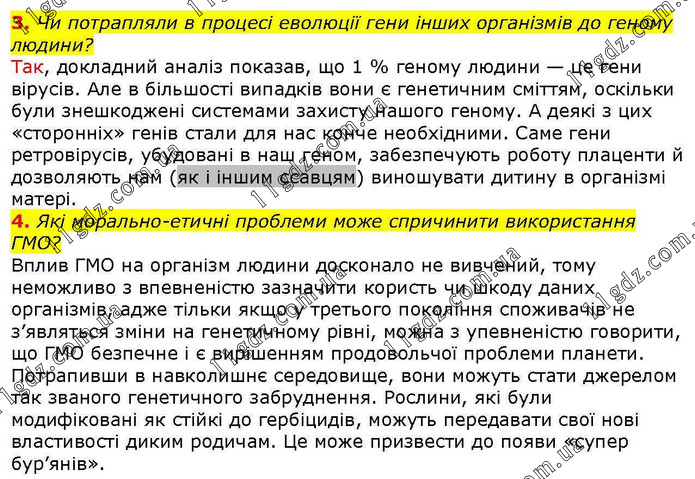 3. Чи потрапляли в процесі еволюції гени інших організмів до геному людини? Так, докладний аналіз показав, що 1 % геному людини — це гени вірусів. Але в більшості випадків вони є генетичним сміттям, оскільки були знешкоджені системами захисту нашого геному. А деякі з цих «сторонніх» генів стали для нас конче необхідними. Саме гени ретровірусів, убудовані в наш геном, забезпечують роботу плаценти й дозволяють нам (як і іншим ссавцям) виношувати дитину в організмі матері. 4. Які морально-етичні проблеми може спричинити використання ГМО? Вплив ГМО на організм людини досконало не вивчений, тому неможливо з впевненістю зазначити користь чи шкоду даних організмів, адже тільки якщо у третього покоління споживачів не з’являться зміни на генетичному рівні, можна з упевненістю говорити, що ГМО безпечне і є вирішенням продовольчої проблеми планети. Потрапивши в навколишнє середовище, вони можуть стати джерелом так званого генетичного забруднення. Рослини, які були модифіковані як стійкі до гербіцидів, можуть передавати свої нові властивості диким родичам. Це може призвести до появи «супер бур’янів».