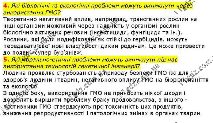 4. Які біологічні та екологічні проблеми можуть виникнути через використання ГМО? Теоретично негативний вплив, наприклад, трансгенних рослин на інші організми можливий через наявність у організмі рослин біологічно активних речовин (інсектициди, фунгіциди та ін.). Рослини, які були модифіковані як стійкі до гербіцидів, можуть передавати свої нові властивості диким родичам. Це може призвести до появи «супер бур’янів». 5. Які морально-етичні проблеми можуть виникнути під час використання технологій генетичної інженерії? Людина проявляє стурбованість з приводу безпеки ГМО їжі для здоров'я людини і тварин, негативного впливу ГМО на біорізноманіття та екологію. З одного боку, використання ГМО не приносить ніякої шкоди і дозволить вирішити проблему браку продовольства, з іншого - противники ГМО стверджують про токсичність цих продуктів, зниження репродуктивності і патологічних змінах в органах тварин.