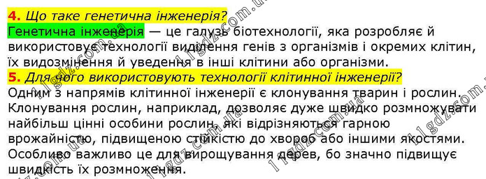 4. Що таке генетична інженерія? Генетична інженерія — це галузь біотехнології, яка розробляє й використовує технології виділення генів з організмів і окремих клітин, їх видозмінення й уведення в інші клітини або організми. 5. Для чого використовують технології клітинної інженерії? Одним з напрямів клітинної інженерії є клонування тварин і рослин. Клонування рослин, наприклад, дозволяє дуже швидко розмножувати найбільш цінні особини рослин, які відрізняються гарною врожайністю, підвищеною стійкістю до хвороб або іншими якостями. Особливо важливо це для вирощування дерев, бо значно підвищує швидкість їх розмноження.