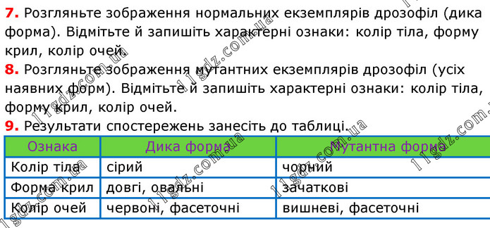 7. Розгляньте зображення нормальних екземплярів дрозофіл (дика форма). Відмітьте й запишіть характерні ознаки: колір тіла, форму крил, колір очей. 8. Розгляньте зображення мутантних екземплярів дрозофіл (усіх наявних форм). Відмітьте й запишіть характерні ознаки: колір тіла, форму крил, колір очей. 9. Результати спостережень занесіть до таблиці.