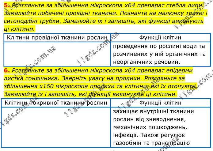 5. Розгляньте за збільшення мікроскопа х64 препарат стебла липи. Замалюйте побачені провідні тканини. Позначте на малюнку трахеї і ситоподібні трубки. Замалюйте їх і запишіть, які функції виконують ці клітини. 6. Розгляньте за збільшення мікроскопа х64 препарат епідерми листка соняшника. Зверніть увагу на продихи. Розгляньте за збільшення х160 мікроскопа продихи та клітини, які їх оточують. Замалюйте їх і запишіть, які функції виконують ці клітини.