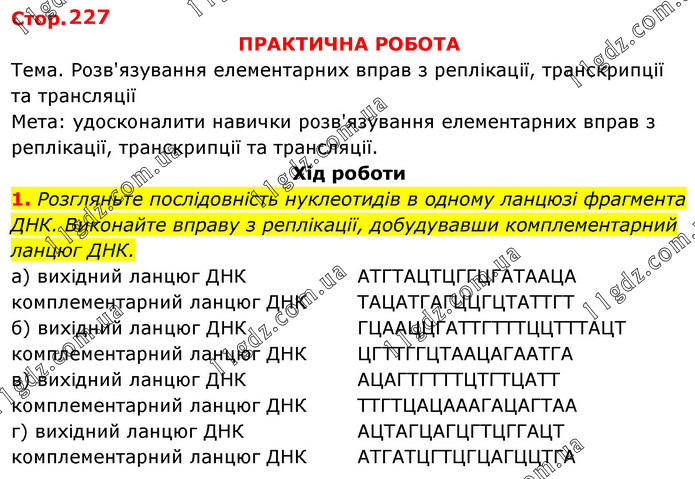 ПРАКТИЧНА РОБОТА Тема. Розв'язування елементарних вправ з реплікації, транскрипції та трансляції Мета: удосконалити навички розв'язування елементарних вправ з реплікації, транскрипції та трансляції. Хід роботи 1. Розгляньте послідовність нуклеотидів в одному ланцюзі фрагмента ДНК. Виконайте вправу з реплікації, добудувавши комплементарний ланцюг ДНК. а) вихідний ланцюг ДНК комплементарний ланцюг ДНК б) вихідний ланцюг ДНК комплементарний ланцюг ДНК в) вихідний ланцюг ДНК комплементарний ланцюг ДНК г) вихідний ланцюг ДНК комплементарний ланцюг ДНК АТГТАЦТЦГГЦГАТААЦА ТАЦАТГАГЦЦГЦТАТТГТ ГЦААЦЦГАТТГТТТЦЦТТТАЦТ ЦГТТГГЦТААЦАГААТГА АЦАГТГТТТЦТГТЦАТТ ТТГТЦАЦАААГАЦАГТАА АЦТАГЦАГЦГТЦГГАЦТ АТГАТЦГТЦГЦАГЦЦТГА