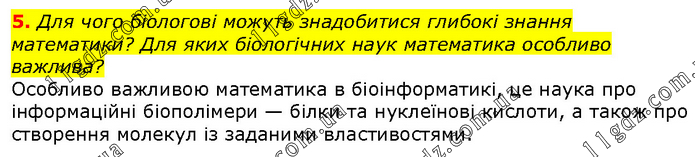 Для чого біологові можуть знадобитися глибокі знання математики? Для яких біологічних наук математика особливо важлива? Особливо важливою математика в біоінформатикі, це наука про інформаційні біополімери — білки та нуклеїнові кислоти, а також про створення молекул із заданими властивостями.