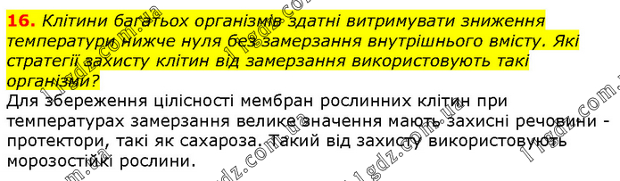 Клітини багатьох організмів здатні витримувати зниження температури нижче нуля без замерзання внутрішнього вмісту. Які стратегії захисту клітин від замерзання використовують такі організми? Для збереження цілісності мембран рослинних клітин при температурах замерзання велике значення мають захисні речовини - протектори, такі як сахароза. Такий від захисту використовують морозостійкі рослини.