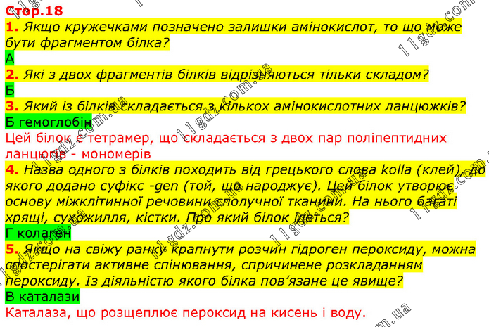 1. Якщо кружечками позначено залишки амінокислот, то що може бути фрагментом білка? А 2. Які з двох фрагментів білків відрізняються тільки складом? Б 3. Який із білків складається з кількох амінокислотних ланцюжків? Б гемоглобін Цей білок є тетрамер, що складається з двох пар поліпептидних ланцюгів - мономерів 4. Назва одного з білків походить від грецького слова kolla (клей), до якого додано суфікс -gen (той, що народжує). Цей білок утворює основу міжклітинної речовини сполучної тканини. На нього багаті хрящі, сухожилля, кістки. Про який білок ідеться? Г колаген 5. Якщо на свіжу ранку крапнути розчин гідроген пероксиду, можна спостерігати активне спінювання, спричинене розкладанням пероксиду. Із діяльністю якого білка пов’язане це явище? В каталази Каталаза, що розщеплює пероксид на кисень і воду.
