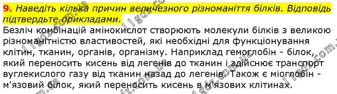 Наведіть кілька причин величезного різноманіття білків. Відповідь підтвердьте прикладами. Безліч комбінацій амінокислот створюють молекули білків з великою різноманітністю властивостей, які необхідні для функціонування клітин, тканин, органів, організму. Наприклад гемоглобін - білок, який переносить кисень від легенів до тканин і здійснює транспорт вуглекислого газу від тканин назад до легенів. Також є міоглобін - м'язовий білок, який переносить кисень в м'язових клітинах.