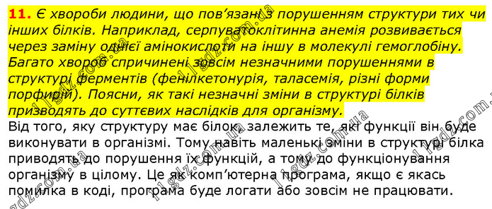 Є хвороби людини, що пов’язані з порушенням структури тих чи інших білків. Наприклад, серпуватоклітинна анемія розвивається через заміну однієї амінокислоти на іншу в молекулі гемоглобіну. Багато хвороб спричинені зовсім незначними порушеннями в структурі ферментів (фенілкетонурія, таласемія, різні форми порфирій). Поясни, як такі незначні зміни в структурі білків призводять до суттєвих наслідків для організму. Від того, яку структуру має білок, залежить те, які функції він буде виконувати в організмі. Тому навіть маленькі зміни в структурі білка приводять до порушення їх функцій, а тому до функціонування організму в цілому. Це як комп’ютерна програма, якщо є якась помилка в коді, програма буде логати або зовсім не працювати.