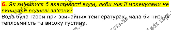 Як змінилися б властивості води, якби між її молекулами не виникали водневі зв’язки? Вода була газом при звичайних температурах, мала би низьку теплоємність та високу густину.