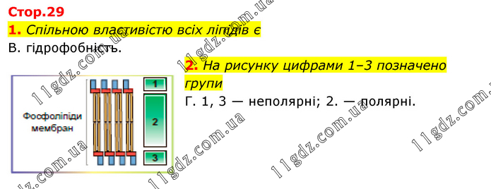 1. Спільною властивістю всіх ліпідів є В. гідрофобність. 2. На рисунку цифрами 1–3 позначено групи Г. 1, 3 — неполярні; 2. — полярні.