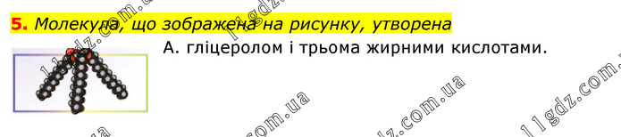 Молекула, що зображена на рисунку, утворена А. гліцеролом і трьома жирними кислотами.