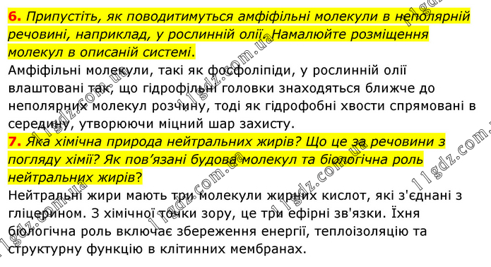 6. Припустіть, як поводитимуться амфіфільні молекули в неполярній речовині, наприклад, у рослинній олії. Намалюйте розміщення молекул в описаній системі. Амфіфільні молекули, такі як фосфоліпіди, у рослинній олії влаштовані так, що гідрофільні головки знаходяться ближче до неполярних молекул розчину, тоді як гідрофобні хвости спрямовані в середину, утворюючи міцний шар захисту. 7. Яка хімічна природа нейтральних жирів? Що це за речовини з погляду хімії? Як пов’язані будова молекул та біологічна роль нейтральних жирів? Нейтральні жири мають три молекули жирних кислот, які з'єднані з гліцерином. З хімічної точки зору, це три ефірні зв'язки. Їхня біологічна роль включає збереження енергії, теплоізоляцію та структурну функцію в клітинних мембранах.