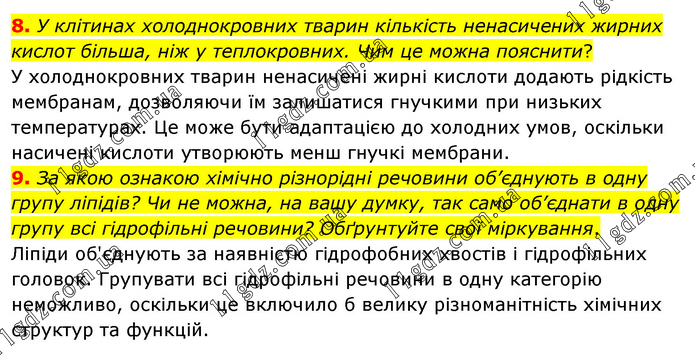 8. У клітинах холоднокровних тварин кількість ненасичених жирних кислот більша, ніж у теплокровних. Чим це можна пояснити? У холоднокровних тварин ненасичені жирні кислоти додають рідкість мембранам, дозволяючи їм залишатися гнучкими при низьких температурах. Це може бути адаптацією до холодних умов, оскільки насичені кислоти утворюють менш гнучкі мембрани. 9. За якою ознакою хімічно різнорідні речовини об’єднують в одну групу ліпідів? Чи не можна, на вашу думку, так само об’єднати в одну групу всі гідрофільні речовини? Обґрунтуйте свої міркування. Ліпіди об'єднують за наявністю гідрофобних хвостів і гідрофільних головок. Групувати всі гідрофільні речовини в одну категорію неможливо, оскільки це включило б велику різноманітність хімічних структур та функцій.