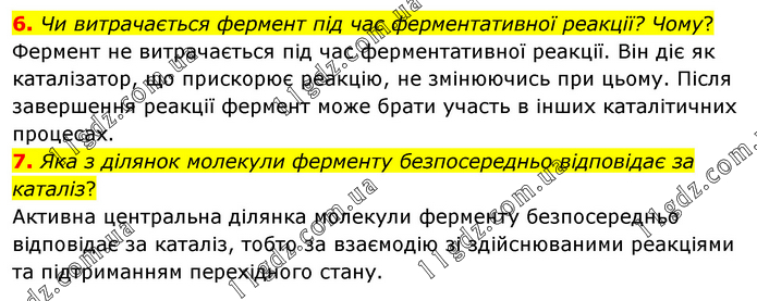 6. Чи витрачається фермент під час ферментативної реакції? Чому? Фермент не витрачається під час ферментативної реакції. Він діє як каталізатор, що прискорює реакцію, не змінюючись при цьому. Після завершення реакції фермент може брати участь в інших каталітичних процесах. 7. Яка з ділянок молекули ферменту безпосередньо відповідає за каталіз? Активна центральна ділянка молекули ферменту безпосередньо відповідає за каталіз, тобто за взаємодію зі здійснюваними реакціями та підтриманням перехідного стану.