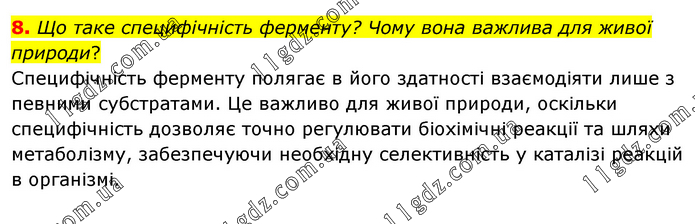 Що таке специфічність ферменту? Чому вона важлива для живої природи? Специфічність ферменту полягає в його здатності взаємодіяти лише з певними субстратами. Це важливо для живої природи, оскільки специфічність дозволяє точно регулювати біохімічні реакції та шляхи метаболізму, забезпечуючи необхідну селективність у каталізі реакцій в організмі.