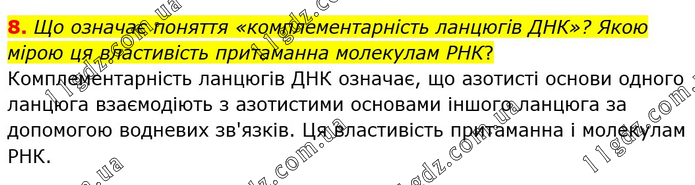 Що означає поняття «комплементарність ланцюгів ДНК»? Якою мірою ця властивість притаманна молекулам РНК? Комплементарність ланцюгів ДНК означає, що азотисті основи одного ланцюга взаємодіють з азотистими основами іншого ланцюга за допомогою водневих зв'язків. Ця властивість притаманна і молекулам РНК.