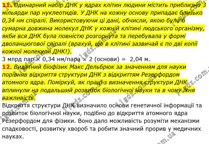 11. Одинарний набір ДНК у ядрах клітин людини містить приблизно 3 мільярди пар нуклеотидів. У ДНК на кожну основу припадає близько 0,34 нм спіралі. Використовуючи ці дані, обчисли, якою була б сумарна довжина молекул ДНК у кожній клітині людського організму, якби вся ДНК була повністю розгорнута та перебувала у формі дволанцюгової спіралі (врахуй, що в клітині зазвичай є по дві копії кожної молекули ДНК!). 3 млрд пар × 0,34 нм/пара × 2 (основи) = 2,04 м. 12. Видатний біофізик Макс Дельбрюк за значенням для науки порівняв відкриття структури ДНК з відкриттям Резерфордом атомного ядра. Поміркуй, як праці з визначення структури ДНК вплинули на подальший розвиток біологічної науки та в чому їхня важливість. Відкриття структури ДНК визначило основи генетичної інформації та розвиток біологічної науки, подібно до відкриття атомного ядра Резерфордом для фізики. Воно дало можливість розуміти механізми спадковості, розвитку хвороб та робити значний прорив у медичних науках.
