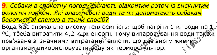 Собаки в спекотну погоду дихають відкритим ротом із висунутим вологим язиком. Які властивості води та як допомагають собакам боротися зі спекою в такий спосіб? Вода має аномально високу теплоємність: щоб нагріти 1 кг води на 1 ºС, треба витратити 4,2 кДж енергії. Тому випаровування води також пов’язане зі значними витратами теплоти, що дає змогу живим організмам використовувати воду як терморегулятор.