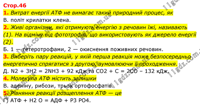 1. Витрат енергії АТФ не вимагає такий природний процес, як В. політ крилатки клена. 2. Живі організми, які отримують енергію з речовин їжі, називають (1). На відміну від фототрофів, що використовують як джерело енергії (2). Б. 1 — гетеротрофами, 2 — окиснення поживних речовин. 3. Виберіть пару реакцій, у якій перша реакція може безпосередньо енергетично спрягатися з другою, зумовлюючи її проходження. Д. N2 + 3H2 = 2NH3 + 92 кДж та CO2 + C = 2CO – 132 кДж. 4. Молекула АТФ містить залишки В. аденіну, рибози, трьох ортофосфатів. 5. Рівняння реакції розщеплення АТФ — це Г) АТФ + Н2 О = АДФ + Р3 РО4.