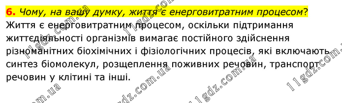 Чому, на вашу думку, життя є енерговитратним процесом? Життя є енерговитратним процесом, оскільки підтримання життєдіяльності організмів вимагає постійного здійснення різноманітних біохімічних і фізіологічних процесів, які включають синтез біомолекул, розщеплення поживних речовин, транспорт речовин у клітині та інші.