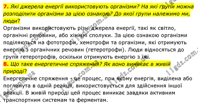7. Які джерела енергії використовують організми? На які групи можна розподілити організми за цією ознакою? До якої групи належимо ми, люди? Організми використовують різні джерела енергії, такі як світло, органічні речовини, або хімічні сполуки. За цією ознакою організми поділяються на фототрофи, хемотрофи та організми, які отримують енергію з органічних речовин (гетеротрофи). Люди відносяться до групи гетеротрофів, оскільки отримують енергію з їжі. 8. Що таке енергетичне спряження? Як воно виникає в живій природі? Енергетичне спряження - це процес, при якому енергія, виділена або поглинута в одній реакції, використовується для здійснення іншої реакції. В живій природі цей процес виникає завдяки активним транспортним системам та ферментам.