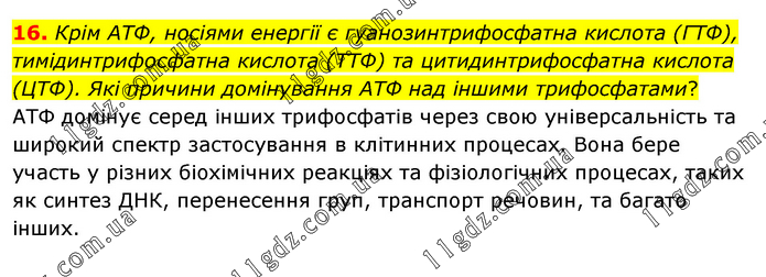 Крім АТФ, носіями енергії є гуанозинтрифосфатна кислота (ГТФ), тимідинтрифосфатна кислота (ТТФ) та цитидинтрифосфатна кислота (ЦТФ). Які причини домінування АТФ над іншими трифосфатами? АТФ домінує серед інших трифосфатів через свою універсальність та широкий спектр застосування в клітинних процесах. Вона бере участь у різних біохімічних реакціях та фізіологічних процесах, таких як синтез ДНК, перенесення груп, транспорт речовин, та багато інших.