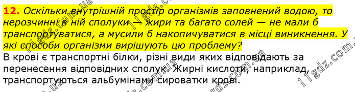 Оскільки внутрішній простір організмів заповнений водою, то нерозчинні в ній сполуки — жири та багато солей — не мали б транспортуватися, а мусили б накопичуватися в місці виникнення. У які способи організми вирішують цю проблему? В крові є транспортні білки, різні види яких відповідають за перенесення відповідних сполук. Жирні кислоти, наприклад, транспортуються альбумінами сироватки крові.