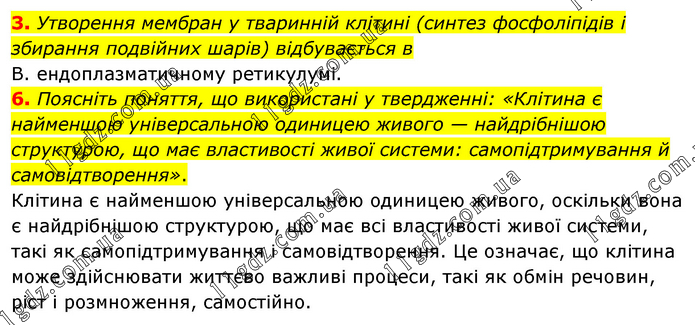 3. Утворення мембран у тваринній клітині (синтез фосфоліпідів і збирання подвійних шарів) відбувається в В. ендоплазматичному ретикулумі. 6. Поясніть поняття, що використані у твердженні: «Клітина є найменшою універсальною одиницею живого — найдрібнішою структурою, що має властивості живої системи: самопідтримування й самовідтворення». Клітина є найменшою універсальною одиницею живого, оскільки вона є найдрібнішою структурою, що має всі властивості живої системи, такі як самопідтримування і самовідтворення. Це означає, що клітина може здійснювати життєво важливі процеси, такі як обмін речовин, ріст і розмноження, самостійно.