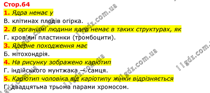 1. Ядра немає у В. клітинах плодів огірка. 2. В організмі людини ядер немає в таких структурах, як Г. кров’яні пластинки (тромбоцити). 3. Ядерне походження має Б. мітохондрія. 4. На рисунку зображено каріотип Г. індійського мунтжака — самця. 5. Каріотип чоловіка від каріотипу жінки відрізняється Г. двадцятьма трьома парами хромосом.