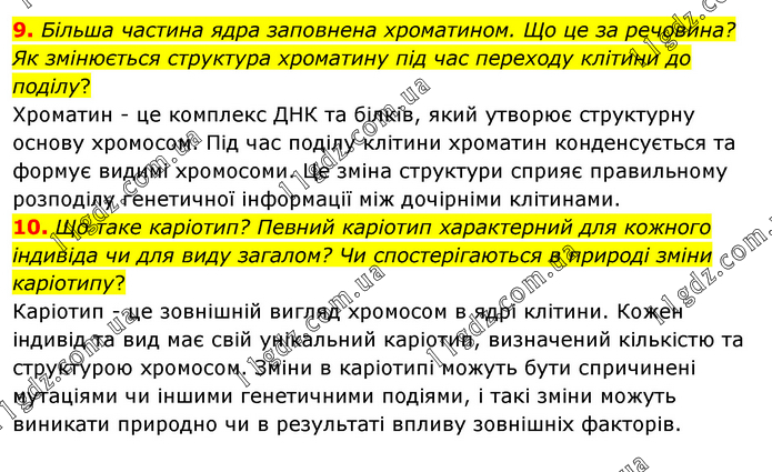 9. Більша частина ядра заповнена хроматином. Що це за речовина? Як змінюється структура хроматину під час переходу клітини до поділу? Хроматин - це комплекс ДНК та білків, який утворює структурну основу хромосом. Під час поділу клітини хроматин конденсується та формує видимі хромосоми. Це зміна структури сприяє правильному розподілу генетичної інформації між дочірніми клітинами. 10. Що таке каріотип? Певний каріотип характерний для кожного індивіда чи для виду загалом? Чи спостерігаються в природі зміни каріотипу? Каріотип - це зовнішній вигляд хромосом в ядрі клітини. Кожен індивід та вид має свій унікальний каріотип, визначений кількістю та структурою хромосом. Зміни в каріотипі можуть бути спричинені мутаціями чи іншими генетичними подіями, і такі зміни можуть виникати природно чи в результаті впливу зовнішніх факторів.